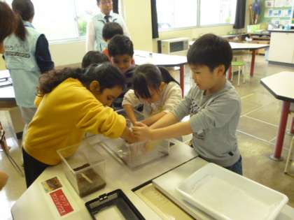 今日はファミリーパークの方による出前授業がありました。始めに、呉羽丘陵に住む生き物について教えていただきました。絶滅危惧種のホクリクサンショウウオは、富山と石川にしかいないことを知りました。そのあとは子供たちが楽しみにしていた生き物タッチングがありました。ヘビやカエル、イモリ、カメを触らせてもらいました。生き物大好きな子供たちは、大喜びで楽しんでいました。