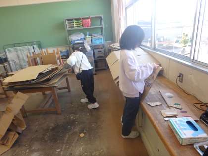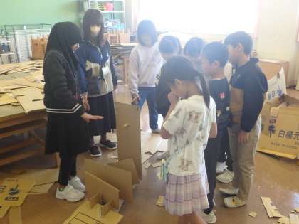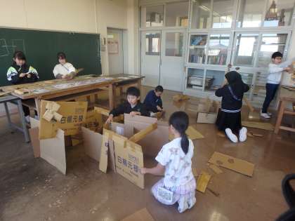 大きな段ボールで迷路を作ったり、友達と協力してパンダを作ったり、段ボールを組み合わせた形から動物に見立てたり、恐竜を作ろうと決めてそれに合わせて段ボールを組み合わせたり、、、それぞれが個性を発揮して作品づくりに取り組みました。