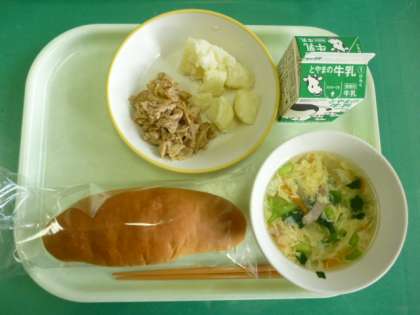 今日の給食は、コッペパン、牛乳、豚肉の甘辛煮、こふきいも、卵のふわふわスープです。