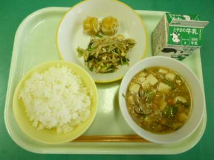 今日の給食は、ごはん、牛乳、にんじんシューマイ、小松菜の大豆そぼろ和え、マーボー豆腐です。