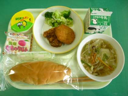 今日の給食は、コッペパン、牛乳、◆豚肉の米粉揚げ◆えびカツ、そえ野菜、ワンタンスープ、〇はちみつレモンゼリー〇ももタルトです。