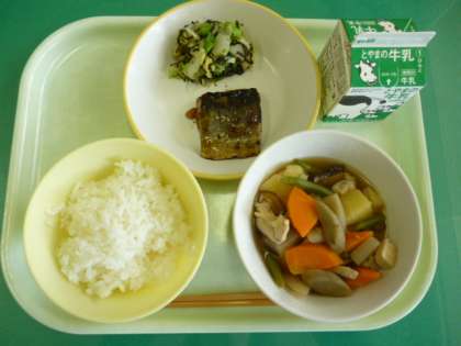 今日の給食は、ごはん、牛乳、にしんの昆布煮、磯和え、筑前だきです。