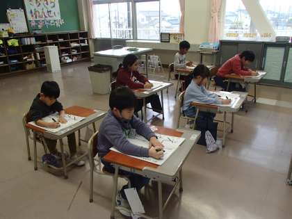 書き初めの練習が始まっています。硬筆墨を使って「えがお」と書きます。お手本をしっかり見ながら、一字一字丁寧に書いています。