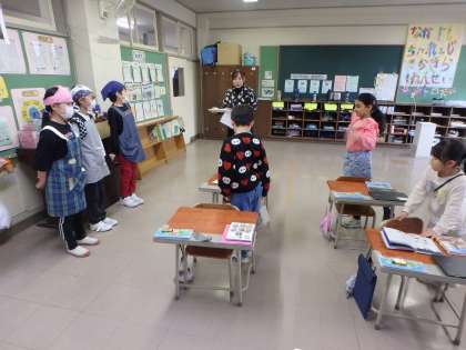 また、全校にお餅を配りに行きました。食べ終わった他の学年からは、「おいしかったよ!」「ありがとう」などと言ってもらえて、5年生はとても喜んでいました。