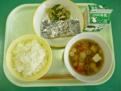 今日の給食は、ごはん、牛乳、さばの銀紙焼き、昆布和え、白玉汁です。