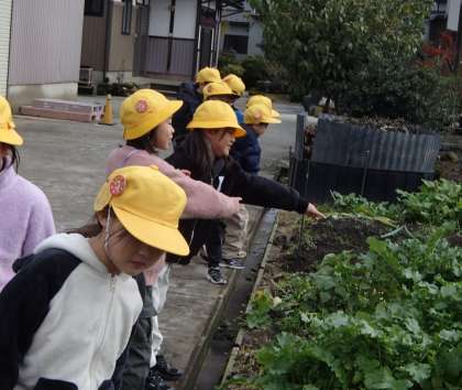 また、畑を見せてもらい、自分たちの育てている野菜と比べて「どうしてこんなに大きく育っているのかな」と疑問を持ちました。「水がたまらないようにしたらよい」というアドバイスをもらい、学校に帰ってからみんなで水の通り道を作ってみました。みんなで考えながら育てています。