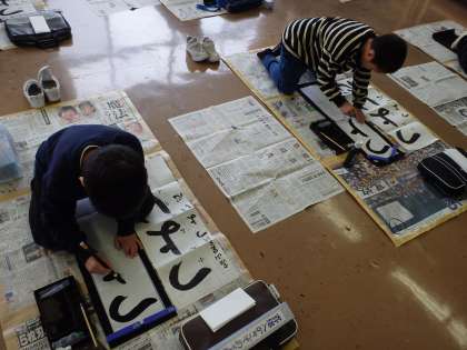書き初めの練習が本格的に始まり、今日は本番と同じように、長い下敷きを使って床で書く練習をしました。先生の書き方をしっかり見て、自分の練習に生かしていました。