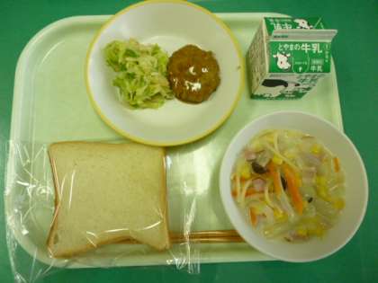 今日の給食は、食パン、牛乳、鶏つくね、切干大根のサラダ、クリームスパゲッティです。