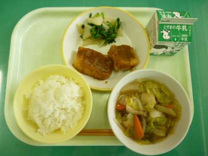 今日の給食は、ごはん、牛乳、揚げ出し豆腐のごまだれかけ、かぶの色どり、冬野菜なべです。