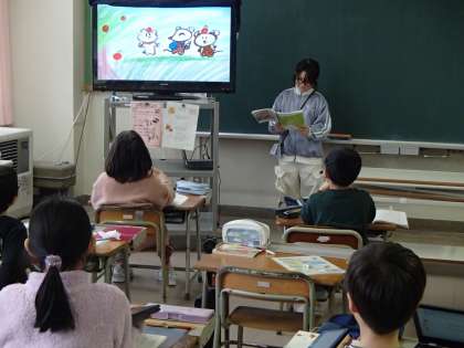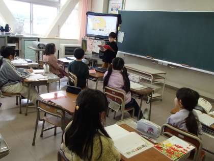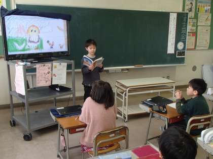 自分が考えた話を、絵を見せながら話しました。初め、中、終わりのまとまりを意識して、お話を考えることができました。