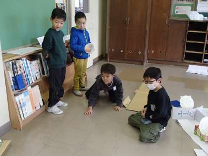友達のつくったおもちゃをお互いに遊ばせてもらいました。説明をしたり、アドバイスをしたりしながら、楽しく活動していました。