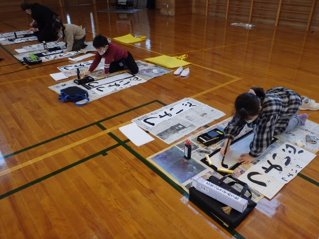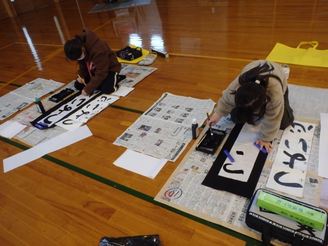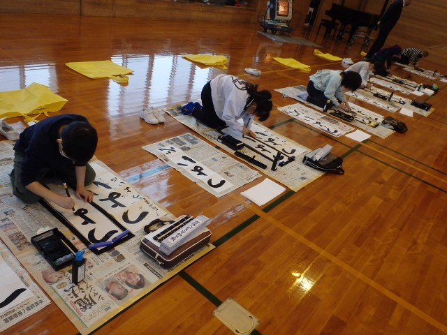 始業式の後は、書初大会でした。3~6年生は体育館に集まって一斉に行います。