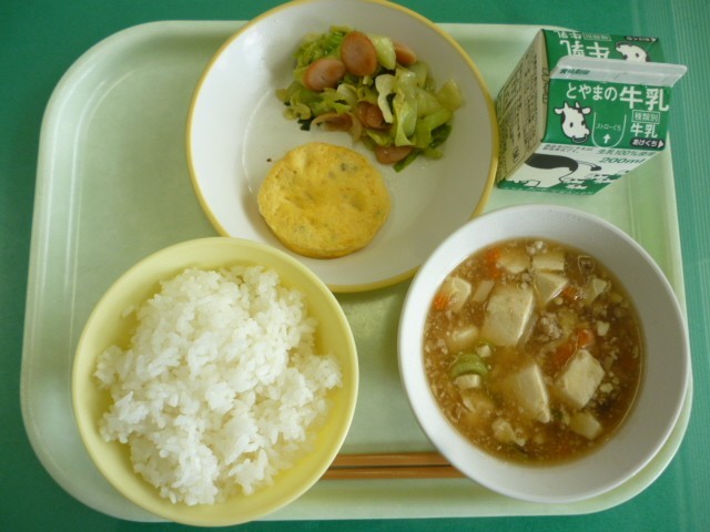 今日の給食は、ごはん、牛乳、かにたま、チンゲンサイソテー、マーボー豆腐です。