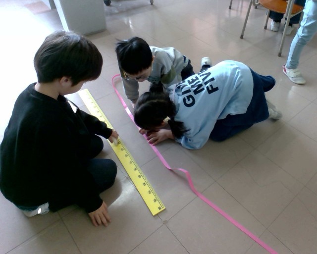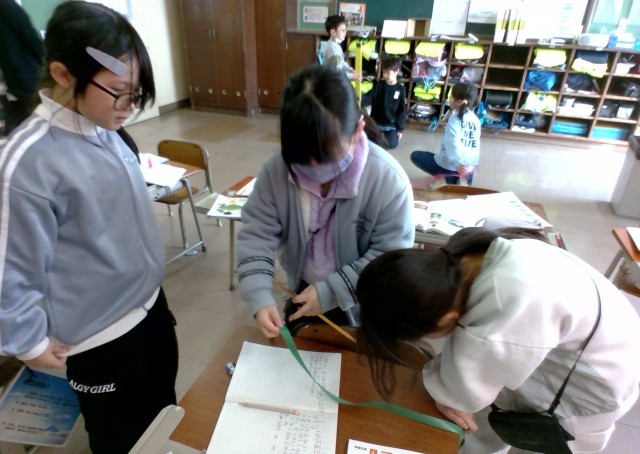 自分が測りたいものの長さを調べました。1mものさしや紙テープ等を使い、工夫して調べていました。また、予想していたよりも長いものが多く、紹介タイムではみんな驚いていました。