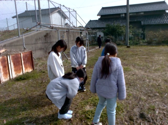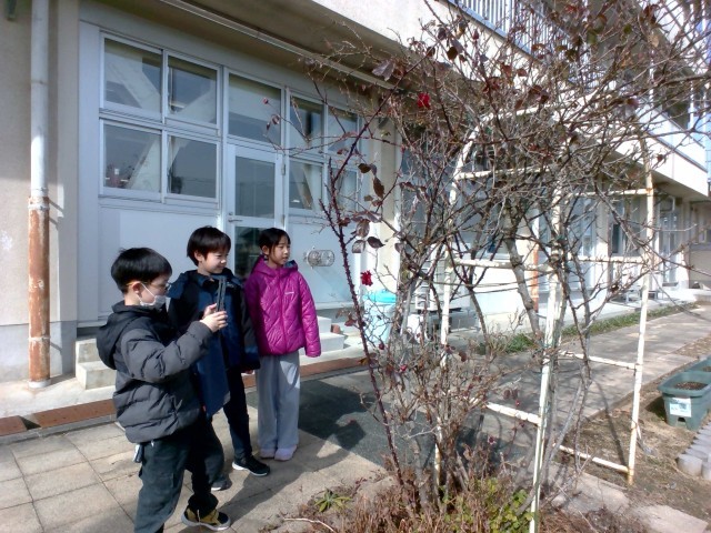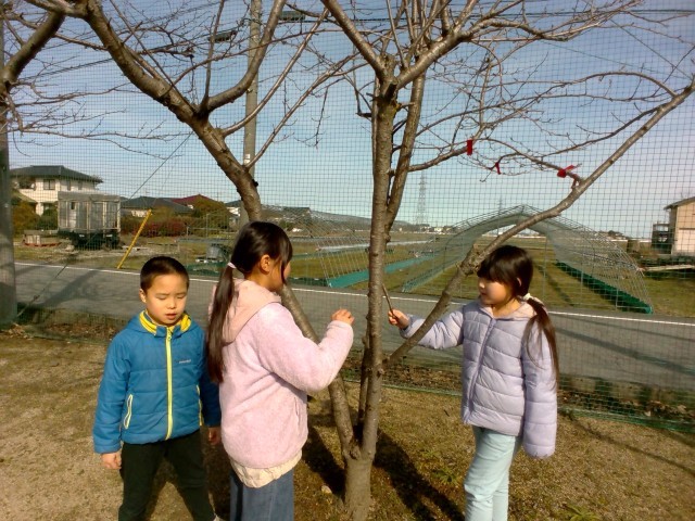 詩に書きたいものを探しに行きました。春との違いをたくさん見付けることができました。また、木を棒でたたいてみると、太さによって音が違うことを発見している子供もいました。