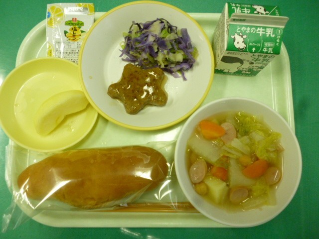 給食週間3日目の今日の献立は、コッペパン、牛乳、星形ハンバーグ、サイエンスサラダ、根茎葉のポトフ、りんごです。