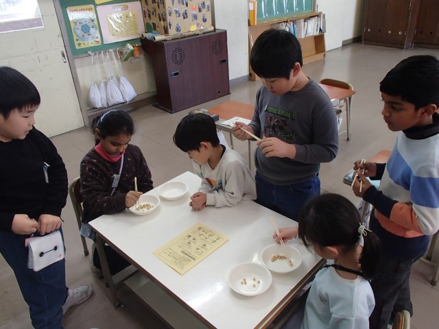 今日は給食週間最終日でした。毎日勉強に関するおいしい献立を食べ、大満足の子供たちでした。また、正しいはしの持ち方をマスターしようと、豆つまみにも挑戦しています。正しく持てているか、お家でもチェックしてみてください。