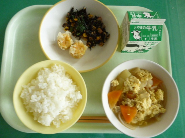 今日の給食は、ごはん、牛乳、にんじんシューマイ、ひじきとコーンのソテー、たまごとじです。