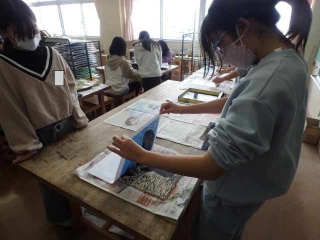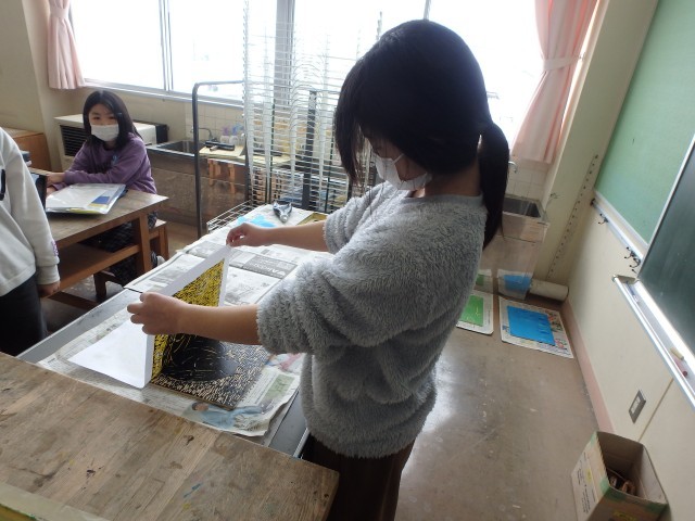 版画の2色刷りに挑戦している5年生です。今日はいよいよ版を刷りました。彫った木目が見え、とてもすてきな仕上がりになり、子供たちも満足そうでした。