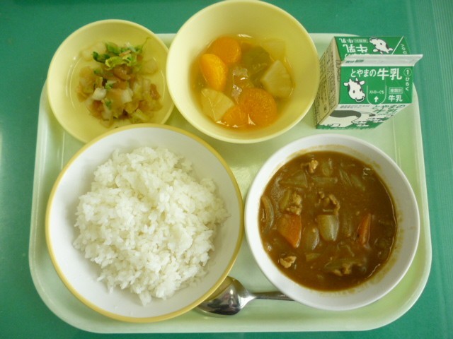 今日の給食は、カレーライス、牛乳、福神和え、フルーツゼリーミックスです。