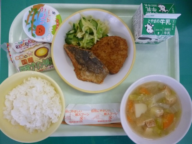 献立は、ご飯、牛乳、和風サラダ、具だくさん汁、ますの竜田揚げ、または肉じゃがコロッケ、りんごゼリー、または豆乳プリンタルトです。