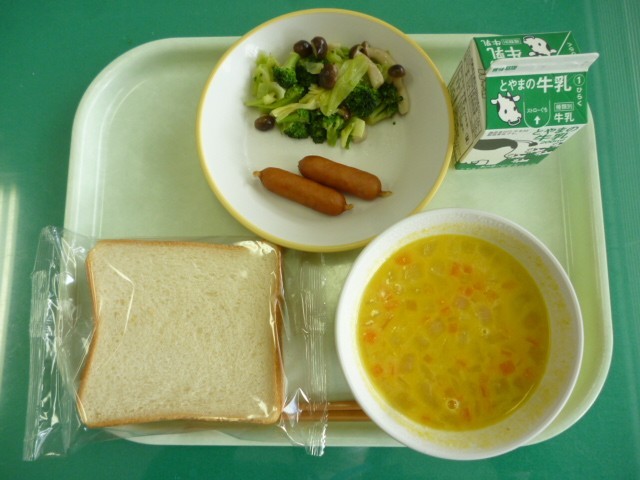 今日の給食は、食パン、牛乳、あらびきウインナー、ブロッコリーときのこのアヒージョ、かぼちゃポタージュです。