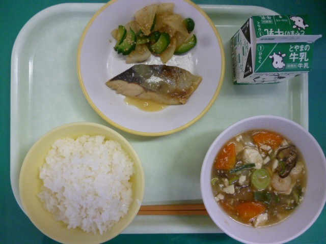 今日の給食は、ごはん、牛乳、ふくらぎの西京焼き、華風和え、えびと豆腐のうま煮です。