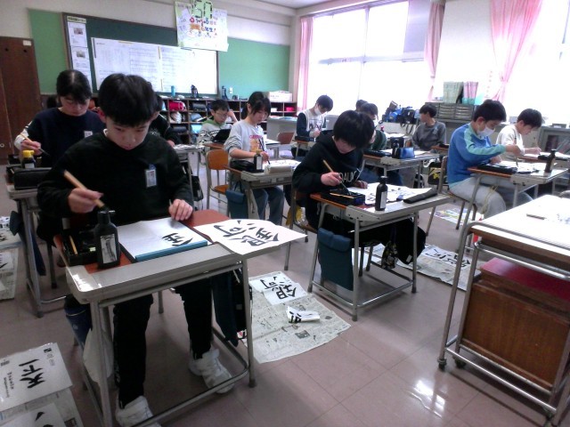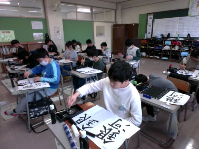 今日は、小学校での最後の毛筆でした。「銀河」という字を集中して書いています。