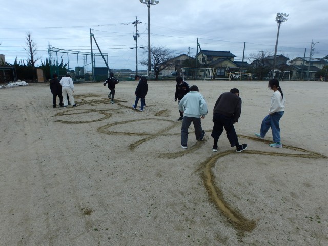 6年生へのサプライズで、5年生がグラウンドに「卒業おめでとう!」の字を書きました。