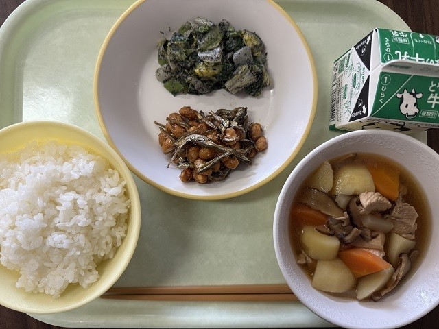今日の給食は、南蛮煮、よごし、小魚入りフライビーンズ、ご飯、牛乳です。