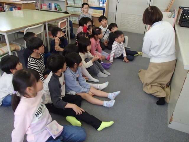 図書室では、司書の先生に読み聞かせをしていただきました。お話に引き込まれるような読み方で読んでくださり、みんな夢中になって聞いていました。