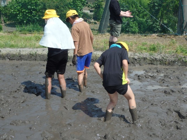 前回、学校の田んぼで田起こしを行いましたが、今日は、水を入れて代かきを行いました。稲の根を張りやすくするために、素足で泥を踏み土を柔らかくしました。振り返りでは、「思っていたよりずっと大変だった」「田起こしをもっとしっかりしておけばよかった」と語るなど、農家の方の大変さを感じ取った子もいました。次は、いよいよ田植えを行います。