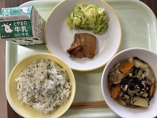 今日の給食は、鶏肉の照り焼き、大豆の磯煮、添え野菜、ご飯、牛乳です。