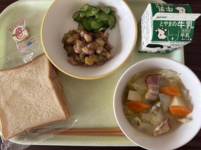 今日の給食は、野菜のスープ煮、あっさりチキン、きゅうりもみ、ポエットチーズ、食パン、牛乳です。