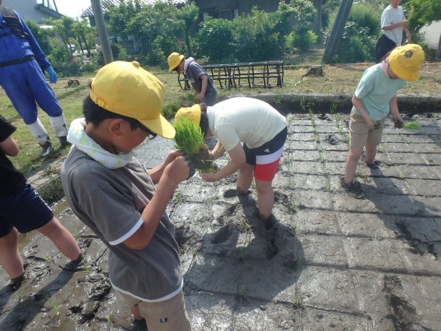 今日は、いよいよ待ちに待った田植えでした。地域の方から、もち米の苗の特徴や植え方を丁寧に教えていただき、子供たちの手で苗を植えました。「植えてからが本番」ということも教えていただき、今後は田んぼの観察や雑草取りをがんばっていきます。