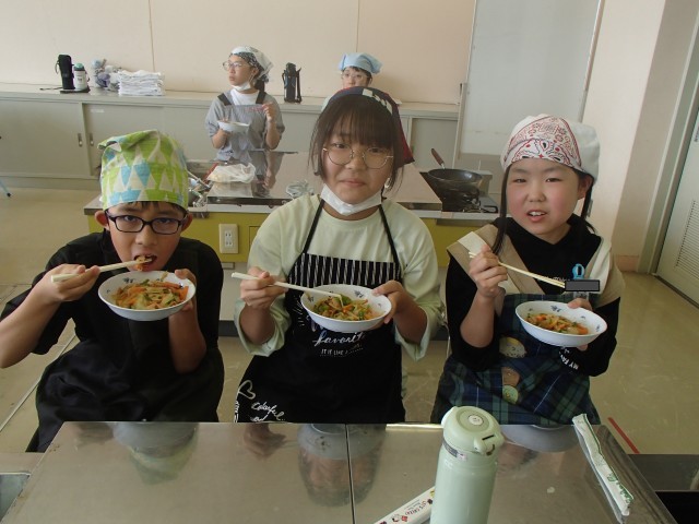 「たまねぎが甘い」「にんじんは、もっとかたいかもしれないと思っていたけれど、やわらかくておいしかった」「ちょっと、味付けが薄かったな。家でも作ってみたい。」という感想が出ていました。