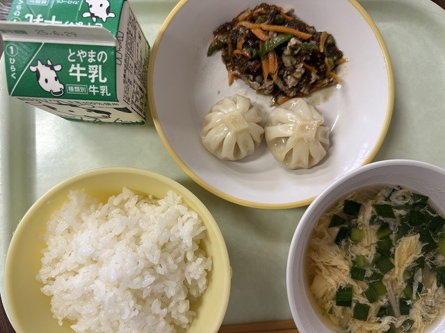 今日の給食は、えび包子(パオツ)、もずくのチャプチェ、にら玉汁、ご飯、牛乳です。