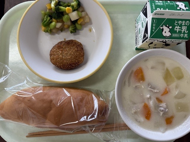 今日の給食は、いわしメンチカツ、コロコロサラダ、クリーム煮、コッペパン、牛乳です。