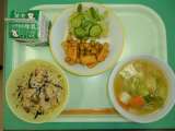 今日の給食は、ひじきごはん、牛乳、いかと豆のカレー揚げ、グリーンサラダ、豆腐ス...