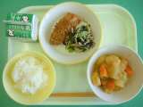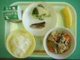 今日の給食は、ごはん、牛乳、魚の利久揚げ、磯和え、関東煮です。