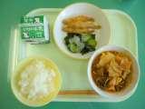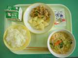 今日の給食は、ごはん、牛乳、豚肉のキムチ炒め、粉ふきいも、中華かき玉汁、味付け...