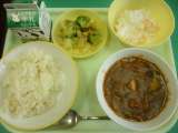 今日の給食は、麦ごはん、牛乳、たべキリンハヤシ、豆豆サラダ、フルーツヨーグルト...