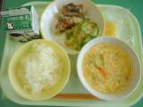 今日の給食は、ごはん、牛乳、ちくわの南部揚げ、はるさめサラダ、かきたま汁、冷凍...