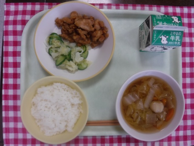 7月18日(金)今日の給食 公開日 2025/07/18 更新日 2025/07/18 本日の給食 今日の献立は、ご飯、牛乳、鶏肉と大豆の甘からめ、きざみ和え、つみれ汁です。つみれがごろごろ入った汁は、出汁がきいて食べ応え抜群です。