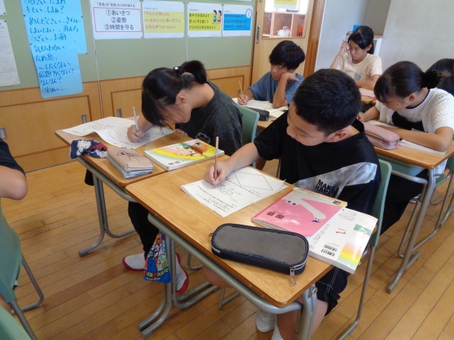 二学期の学習がスタートしました。国語科では、思考ツールを使って自分の考えをまとめています。外国語では、夏休みの思い出を英語で話したり、ALTの話を聞いたりしました。どの学習も課題に向かって一生懸命に取り組んでいます。