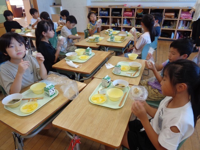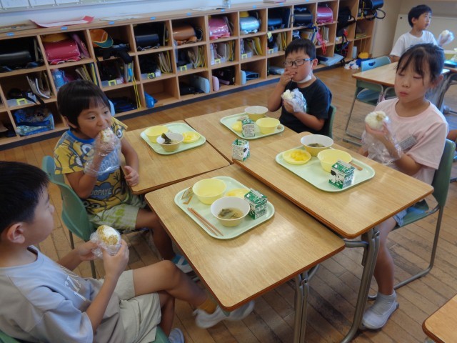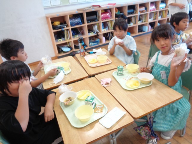 防災献立では、ビニール袋を使い、おにぎりを作って食べました。自分で作ったおにぎりを、みんなおいしそうにほおばっていました。