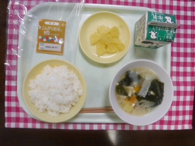 今日の献立は、セルフおにぎり、牛乳、高野豆腐の味噌汁、パイン缶詰、野菜ふりかけです。