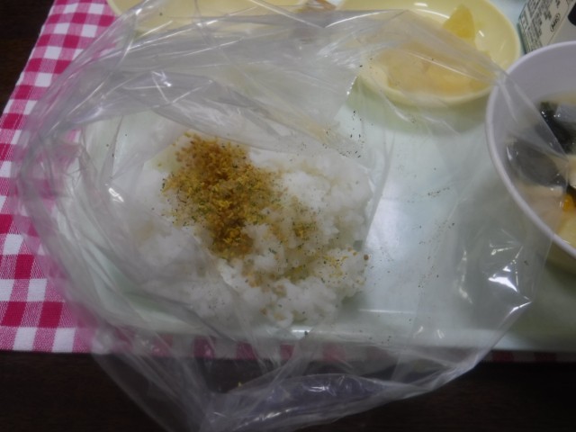 防災の日の献立ということで、長期保存できる備蓄品、日持ちする野菜を使った味噌汁、ナイロン袋を使ったセルフおにぎり等を体験しました。
