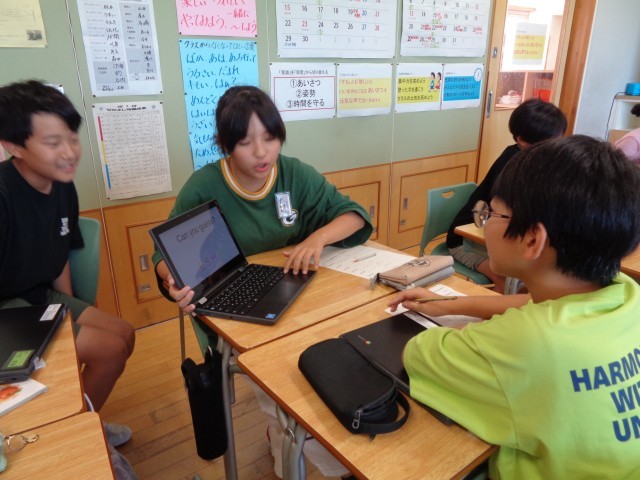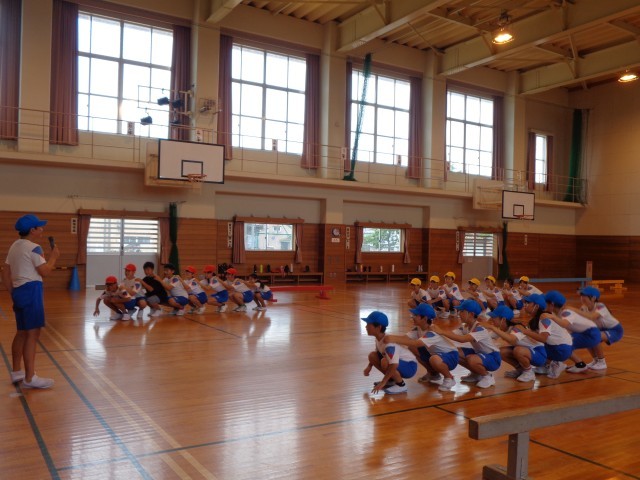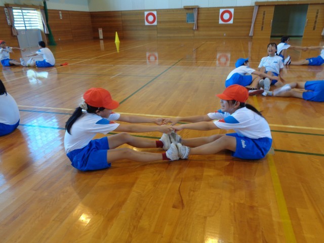 外国語科の学習では、英語でつくった「サンドイッチクイズ」を出し合いました。体育科では、団で考えたオリジナルの遊びをみんなで楽しんだり、友達とストレッチをしたりなど様々な活動を行いました。
