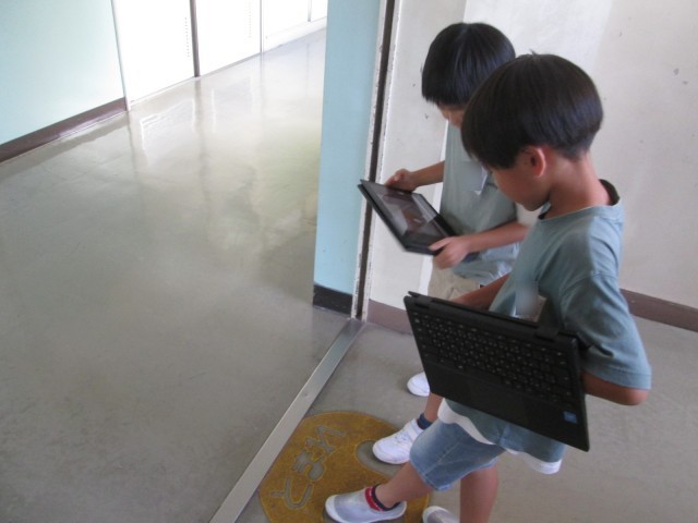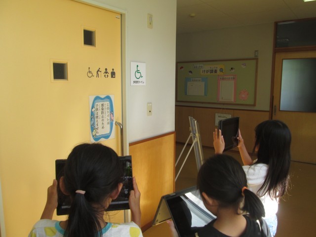 国語科「みの回りのものを読もう」の学習では、ことばや絵などの使い方を工夫して情報を伝えているものについて学習しています。伝えるためにどんな工夫をしているかを学習した後、学校の中で情報を伝えているものを探しました。学校の中でも、たくさん見つけることができました。